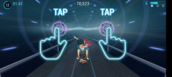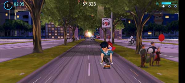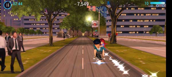 3、游戲開始會是一個男孩背著女孩通過滑板進行跑酷,遇到這種閃光,玩家需要左右滑動來觸碰到閃光得分,觸碰到越多分數也就越多。